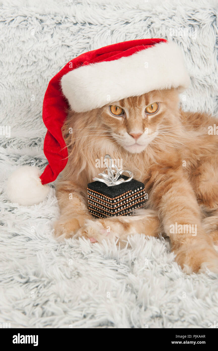 Tabby Cat Lying On A Sofa In A Christmas Hat Stock Photo Image