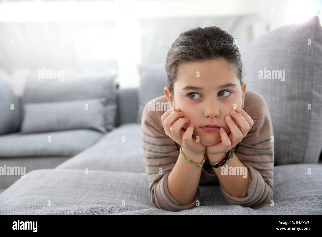 Portrait Of Sad Little Girl Laying On Couch Stock Photo 165240996